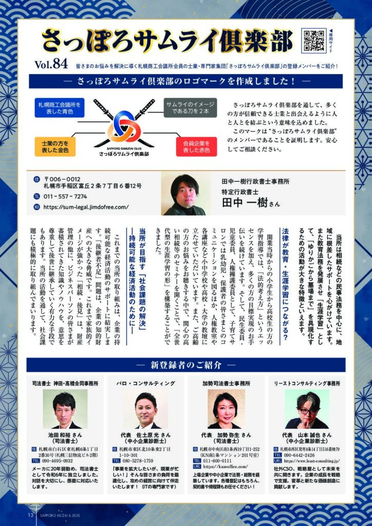 当所の機関紙である「さっぽろ経済」で、「さっぽろサムライ倶楽部」メンバーの紹介記事と新登録者を掲載致しました。